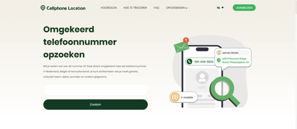 Cellphone Location is a convenient site that enables one to perform a people lookup by number. It searches long lists of databases, Netherlands phone books, government documents, telecommunication information, and social media to find out the owner of any number within a few seconds. You will have a name, address, provider, email, social profiles, and spam report of a caller.