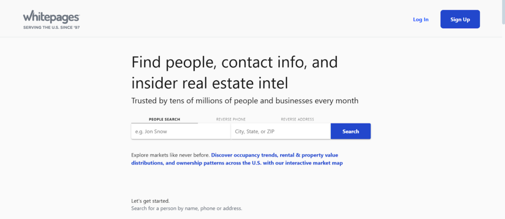 Whitepages is a widely used online telephone directory that has comprehensive features for person lookup. It grants access to background information, phone histories, and address histories. As you look up the name of a person, the site puts together his/her present and past homes in an easy-to-read list. This simplifies movement tracking, verification of identity, or reconnection with persons who have either moved.