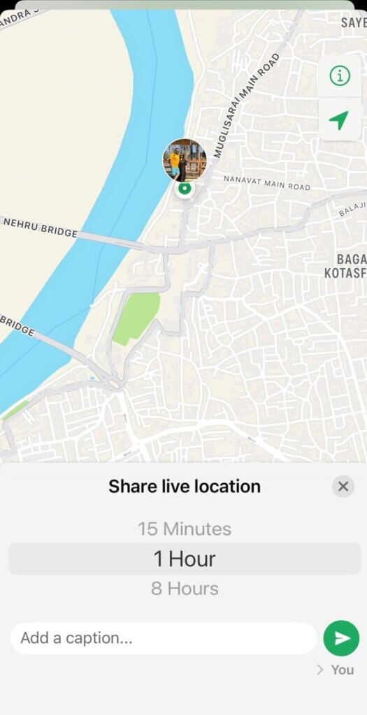 - Tap the attachment (paperclip) → “Location” → “Share live location.”