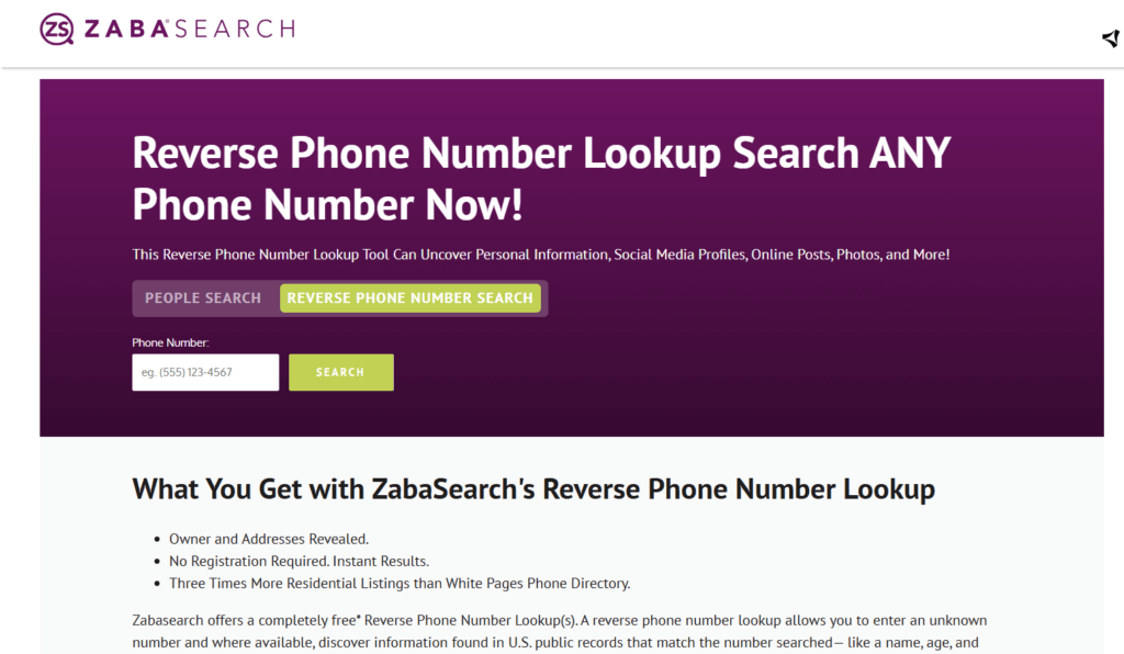 ZabaSearch is a US-based public record search site that lists the names of landline owners, addresses connected to them and any listings available to the public. It is effective in basic identity checks and people searches. Not all data is free, as advanced services are redirected to premium partner services. It is simple, fast, and can be used to look up landline phone numbers without the background analysis.