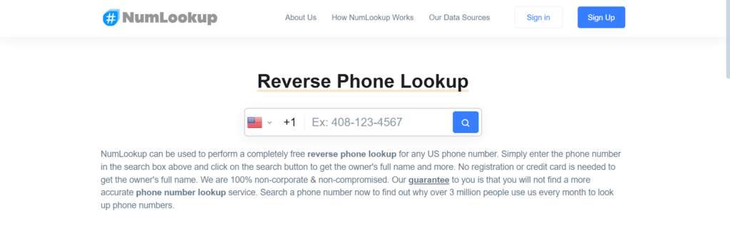 NumLookup is a completely free global phone lookup service that requires no signup. It works for both mobile and landline numbers and provides instant results like caller name, country, carrier, and location. It is international-friendly and fast, making it ideal for users searching unknown numbers worldwide. The data is crowdsourced, so accuracy may vary but results are delivered within seconds without payment.