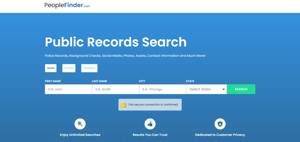 - Visit PeopleFinder and enter the person’s name, city, or phone number.