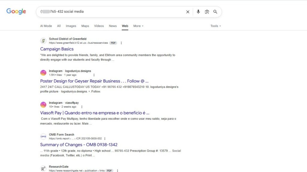 • You can also paste the phone number alongside key terms like “scam”, “social media’ “company” and so on.